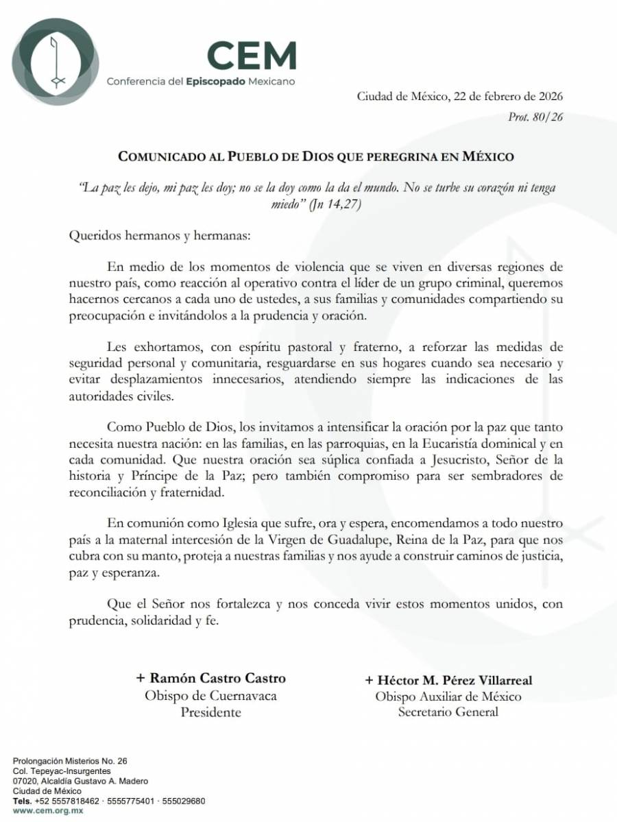 La Conferencia del Episcopado Mexicano (CEM) emitió un comunicado dirigido al “Pueblo de Dios que peregrina en México” ante los episodios de violencia registrados en distintas regiones, tras el operativo contra Nemesio Oseguera Cervantes.