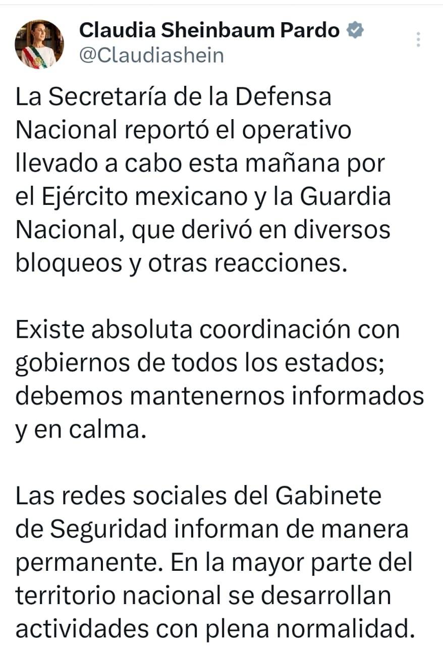 La presidenta Claudia Sheinbaum pidió a la ciudadanía mantener la calma luego del operativo realizado por fuerzas federales, que derivó en bloqueos y reacciones en distintas zonas del país.