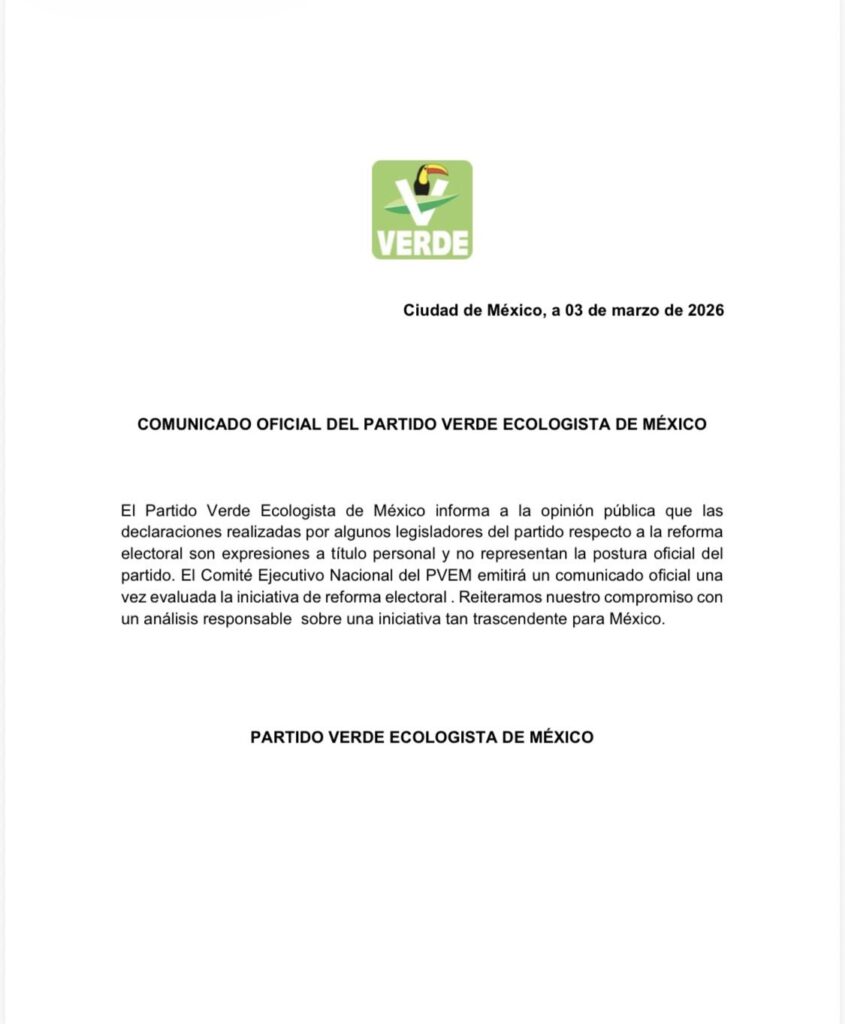 El Partido Verde Ecologista de México (PVEM) aclaró que las declaraciones emitidas por algunos de sus legisladores en torno a la reforma electoral corresponden a posturas personales y no representan la posición oficial del instituto político.