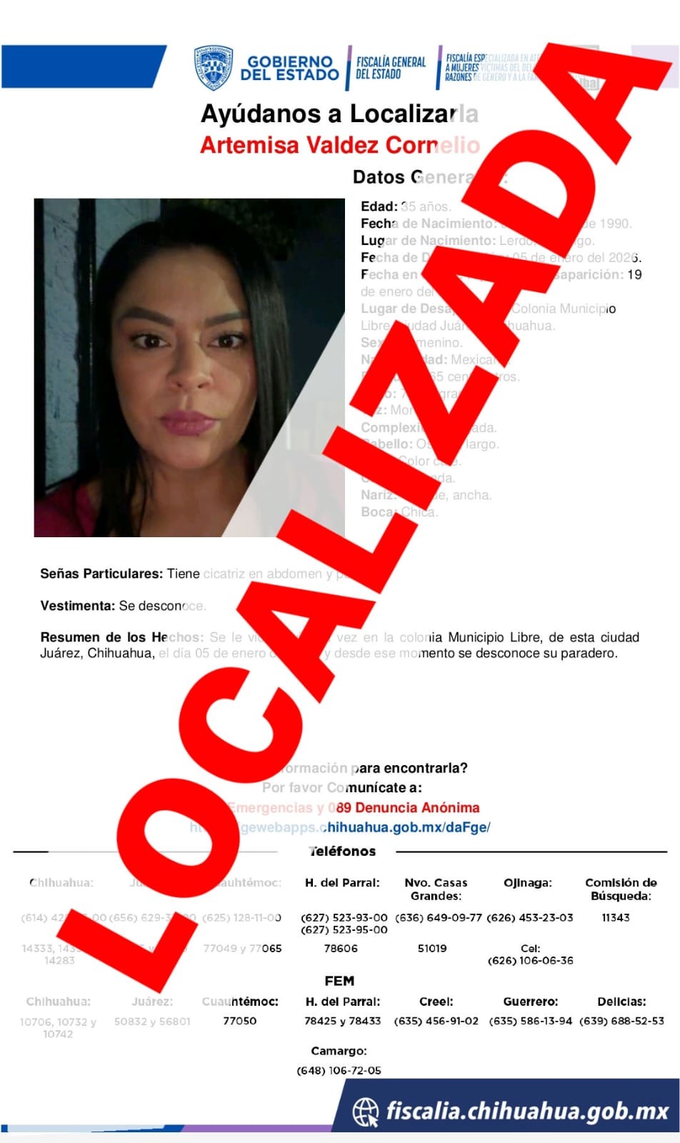Elementos de la Fiscalía Especializada en Atención a Mujeres Víctimas del Delito por Razones de Género y a la Familia de la Zona Norte localizaron sana y salva a Artemisa V. C., quien contaba con reporte de ausencia desde el 19 de enero en Ciudad Juárez.