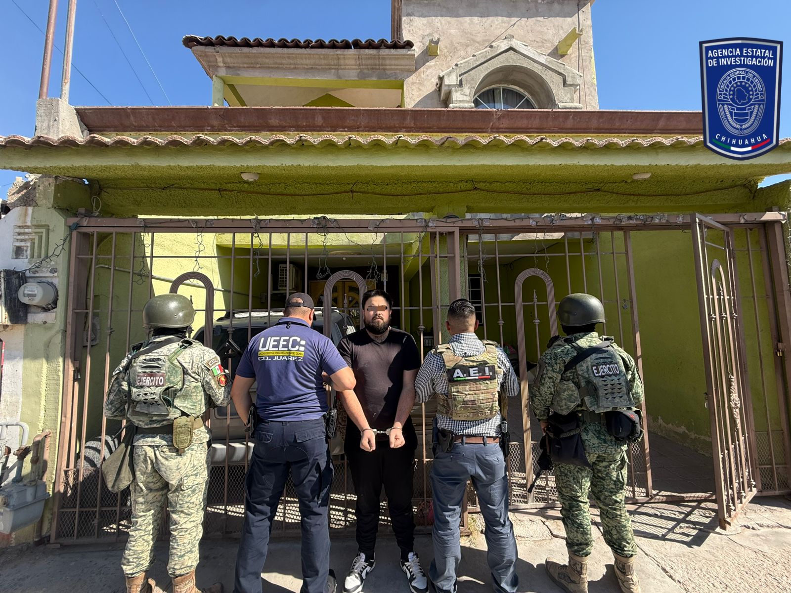 Elementos de la Fiscalía de Distrito Zona Norte detuvieron a Francisco Manuel C. V., señalado como probable responsable del delito de fraude, durante un cateo realizado en la colonia Hacienda de las Torres en Ciudad Juárez.