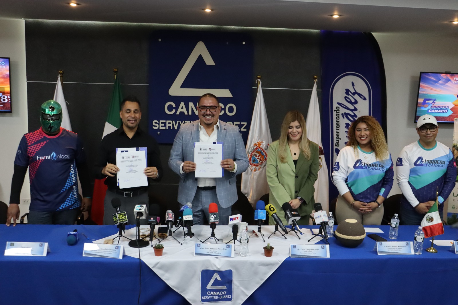 El Instituto Municipal del Deporte y Cultura Física de Juárez y la Cámara Nacional de Comercio firmaron un convenio para dar continuidad al Circuito Atlético Pedestre, que incluye la realización de la quinta carrera CANACO el próximo 8 de noviembre.