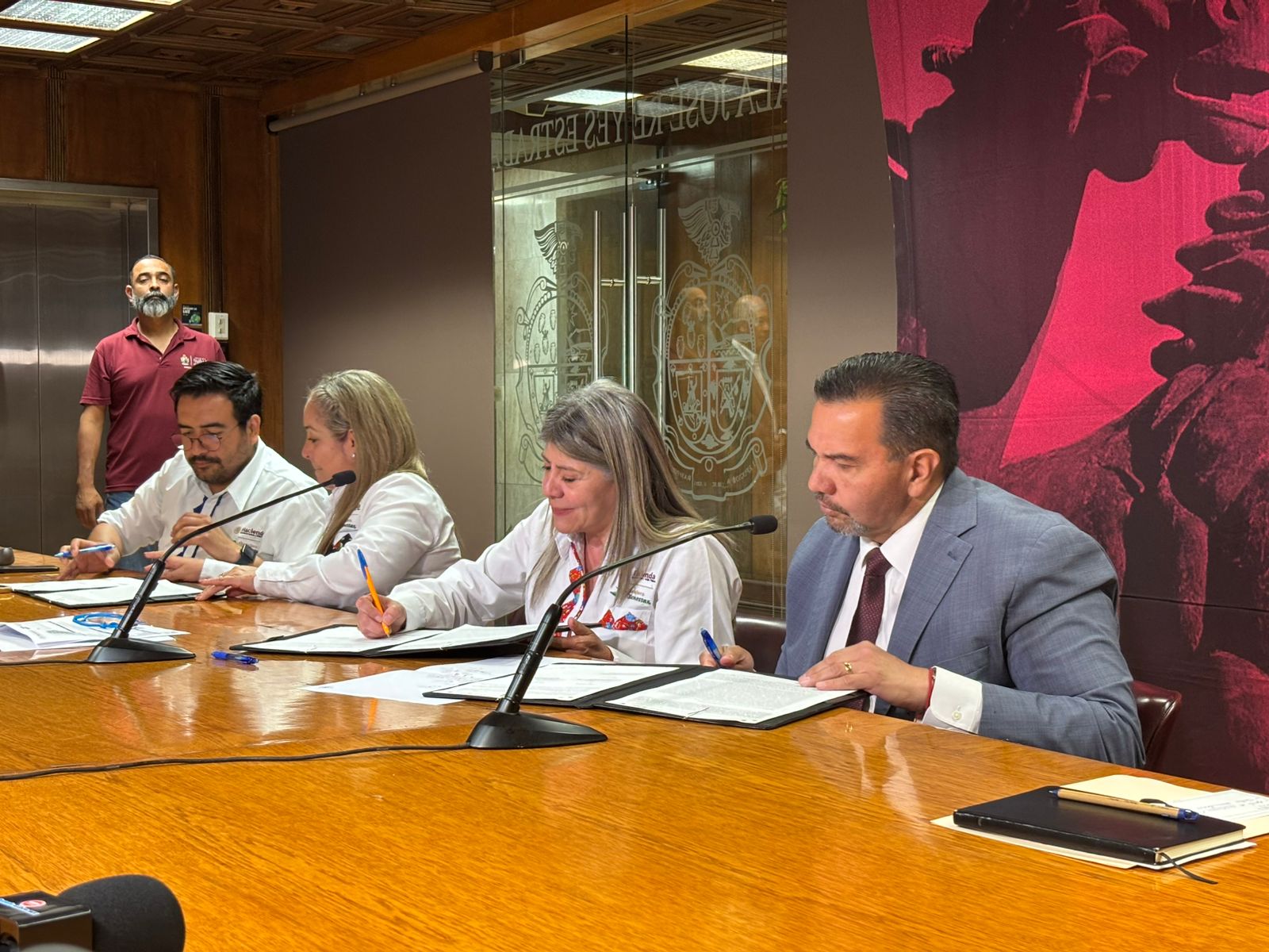 En la firma estuvieron presentes el Director Jurídico del Municipio, Miguel Ángel Mendoza, el Coordinador de Directores, Enrique Licon, la Gerente Estatal en Chihuahua, Judith Vega Murillo y el Director de Servicios Financieros y Operación de Sucursales, Abraham Vázquez.