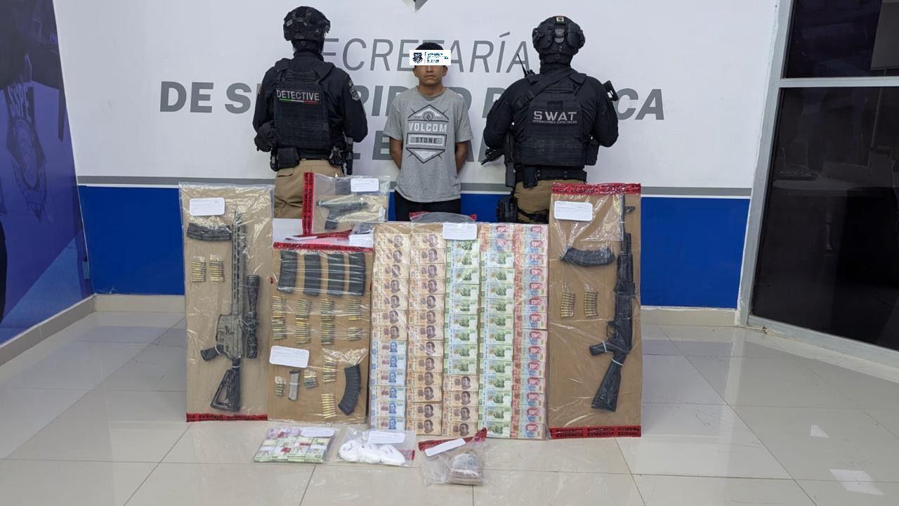 El funcionario mencionó que en las calles Emilio Carranza y Francisco I. Madero, en el poblado El Porvenir fue detenido Christopher Osvaldo Re. G., en poder de tres armas de fuego, múltiples cargadores y cartuchos útiles de distintos calibres, así como diversas cantidades de droga con características de cocaína y ketamina, además de un monto de 95 mil 690 pesos en efectivo.