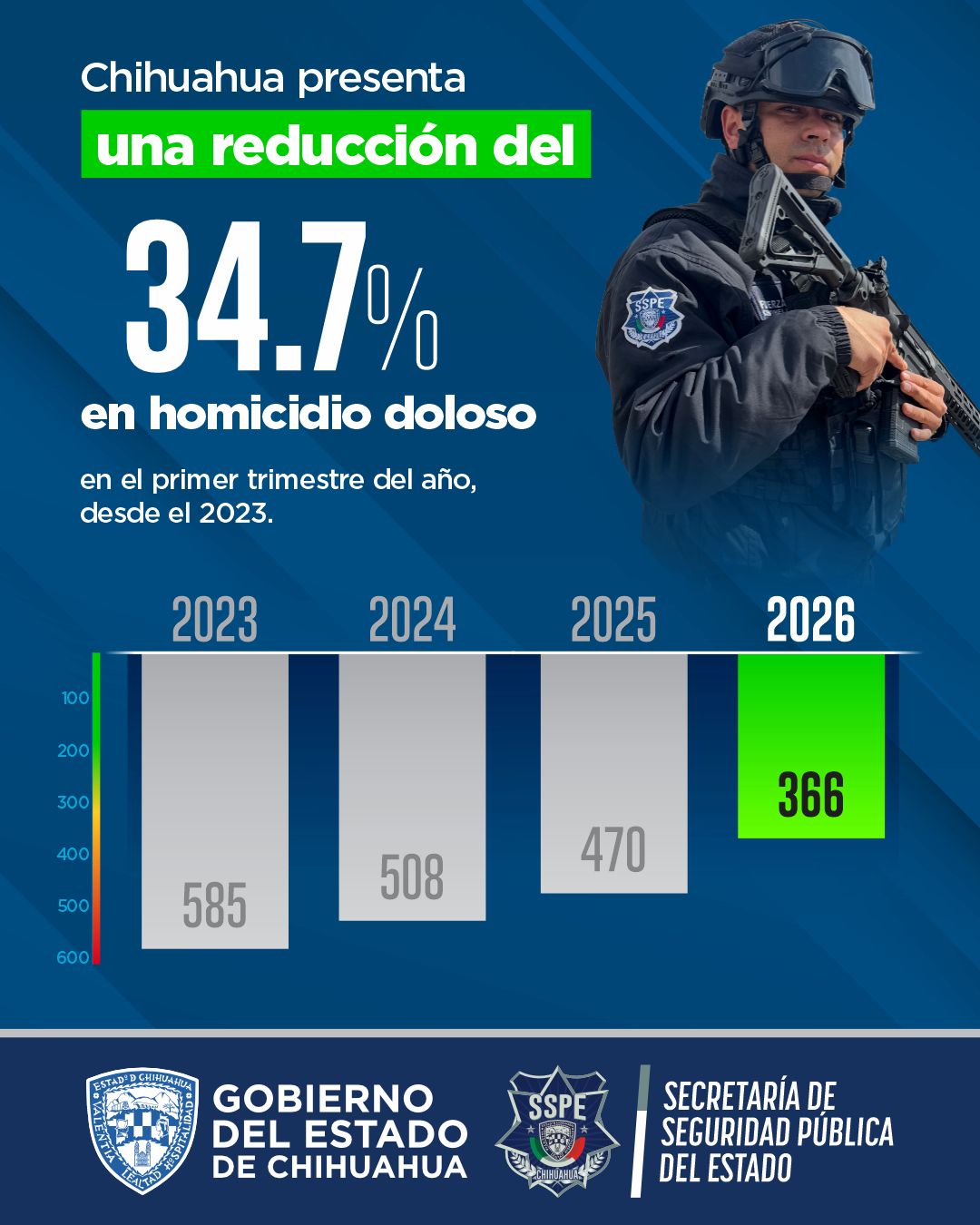 El funcionario mencionó que datos de la corporación, durante el año 2023, el estado acumuló 585 homicidio doloso; para 2024, la cifra descendió a 508, mientras que, en el 2025, se consolidó una reducción adicional al alcanzar 470 hechos violentos, al cierre del mes de marzo del presente año, se ha logrado la cifra más baja con 366 muertes violentas, lo que representa una tendencia clara y consistente a la baja, lo que representa un 34.7 por ciento.