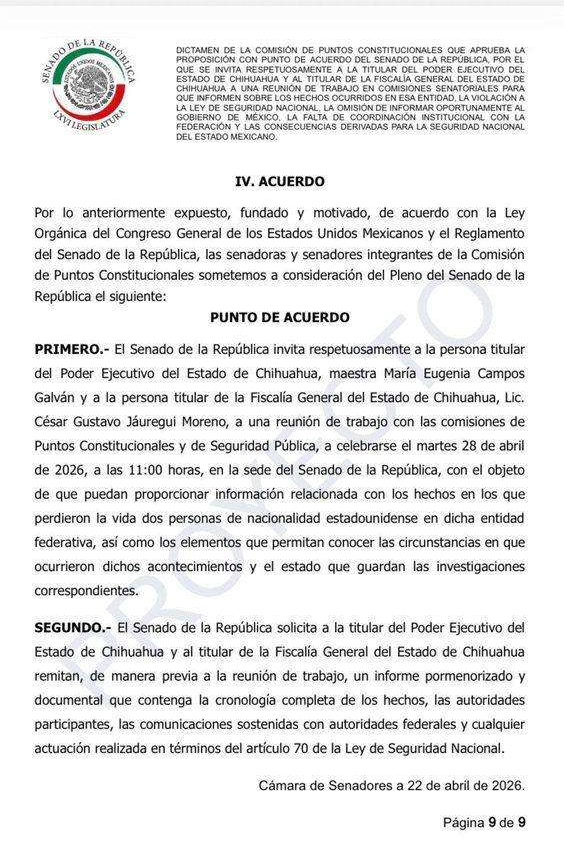 El Senado de la República formalizó la convocatoria para que la gobernadora Maru Campos y el fiscal César Jáuregui Moreno comparezcan ante comisiones legislativas por el caso en el que murieron dos ciudadanos estadounidenses en la entidad.