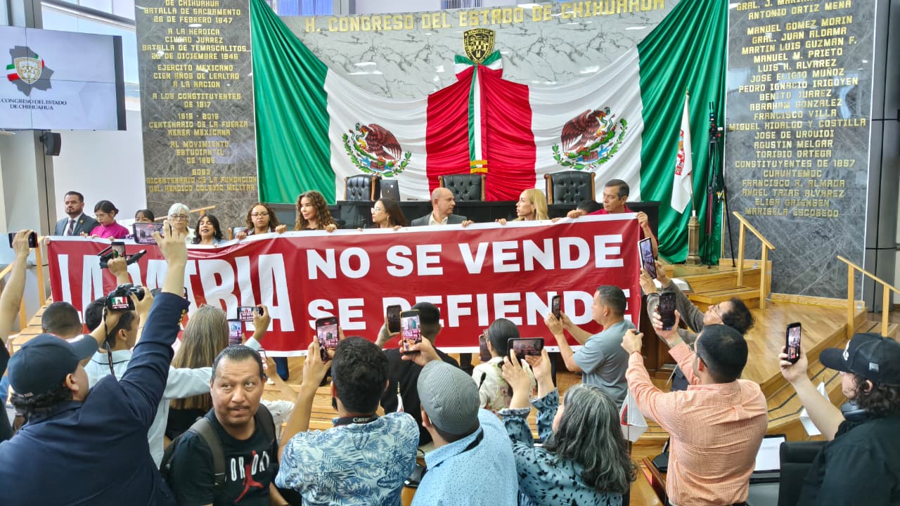 Durante la manifestación, los legisladores lanzaron consignas como “La Patria no se vende” y colocaron una lona en el recinto, además de acusar a la gobernadora de incurrir en una posible violación a la soberanía nacional.