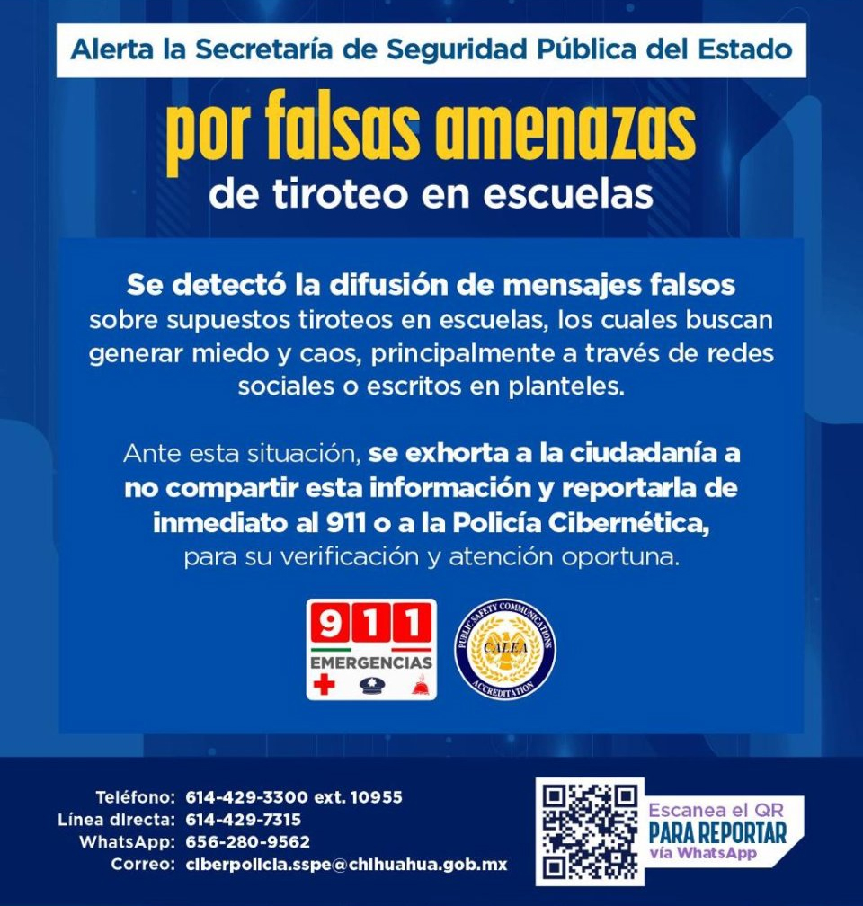 La Secretaría de Seguridad Pública del Estado de Chihuahua advirtió sobre la detección de mensajes que simulan amenazas de tiroteos en planteles escolares, los cuales se están difundiendo en redes sociales y dentro de las propias escuelas.