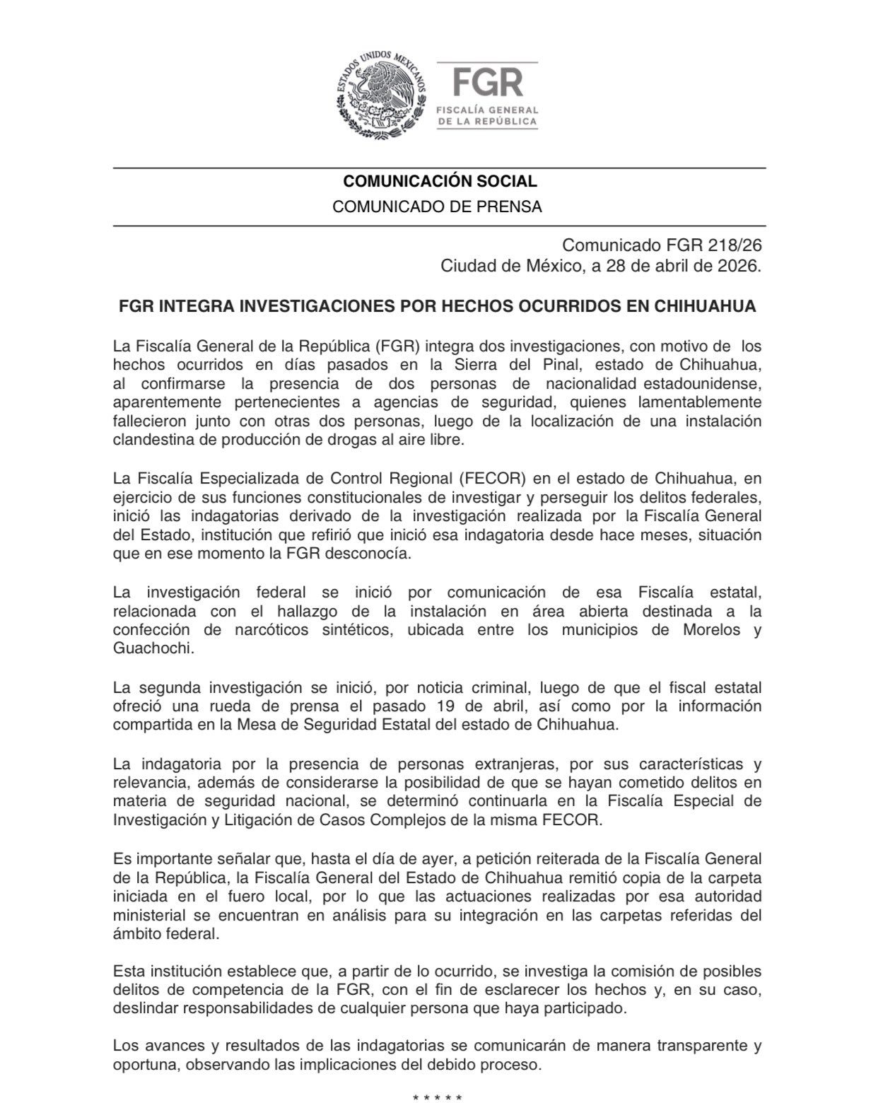 La Fiscalía General de la República informó que abrió dos investigaciones tras los hechos registrados en la Sierra del Pinal, en Chihuahua, donde fueron localizadas cuatro personas sin vida, entre ellas dos de nacionalidad estadounidense presuntamente vinculadas a agencias de seguridad, así como una instalación clandestina para la producción de drogas sintéticas.